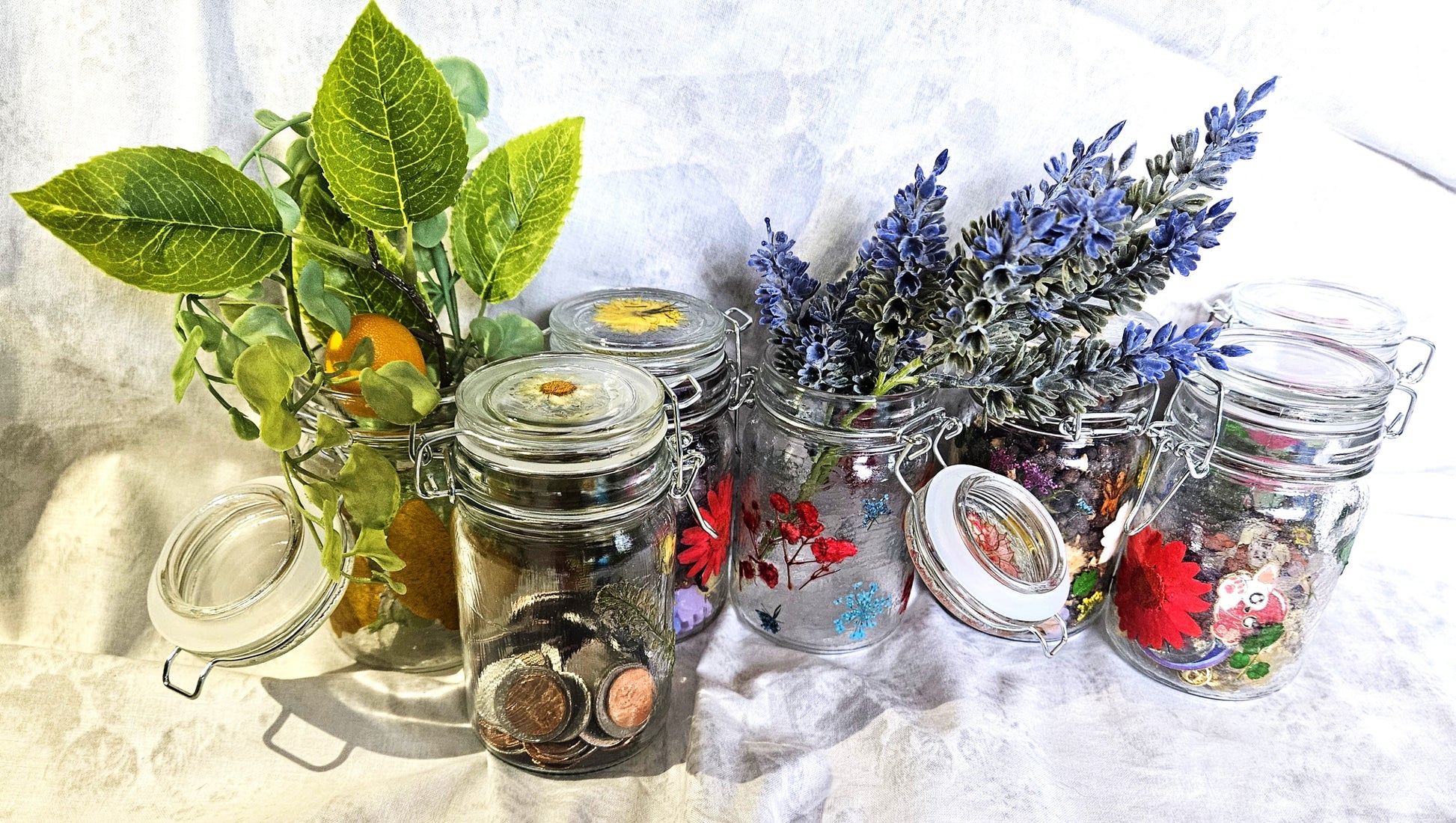 A flip top jar with hand applied pressed, dried flowers. The jar is then sealed. While the sealant is classified as "Dishwasher Safe", we recommend only hand washing with gentle soap and not scrubbing with corrosive products or materials such as steel wool. The glass is marked as food safe. The jars are 4" tall open, 4 1/2" closed, and 2" in diameter. Each is unique and different!